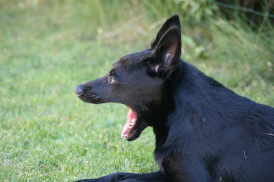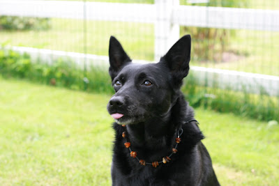 äntligen har Ebba idag gjort MH-test. Jag är ingen större expert men Maria säger hon gick jättebra och jag håller såklart med! Ingen jätteleklust med konstig bitstock men det var tämligen väntat. Stackars spöken blev VÄLDIGT utskällda. Hon var inte rädd direkt men talade länge, högt och modigt om för dom att dom skulle hålla sig på avstånd. Skramlet varkade mest som "sådär låter varje dag hemma när jag försöker komma förbi kompostgallret". Hon var väl lite tagen (som alla andra) av värmen men skötte sig galant. Husses stjärna :)