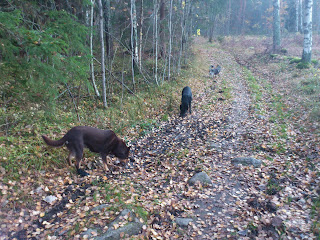 Lördagen blev det promenad med uppletande. Ochra och Ebba klarade det fint. Ebba jobbar intensivt och ger inte upp men hon är än så länge lite planlös i sitt sökande och far lite hursomhelt. Troja stöttade fint med konstant skällande...